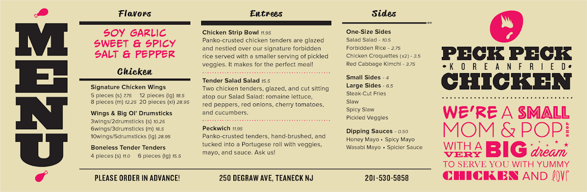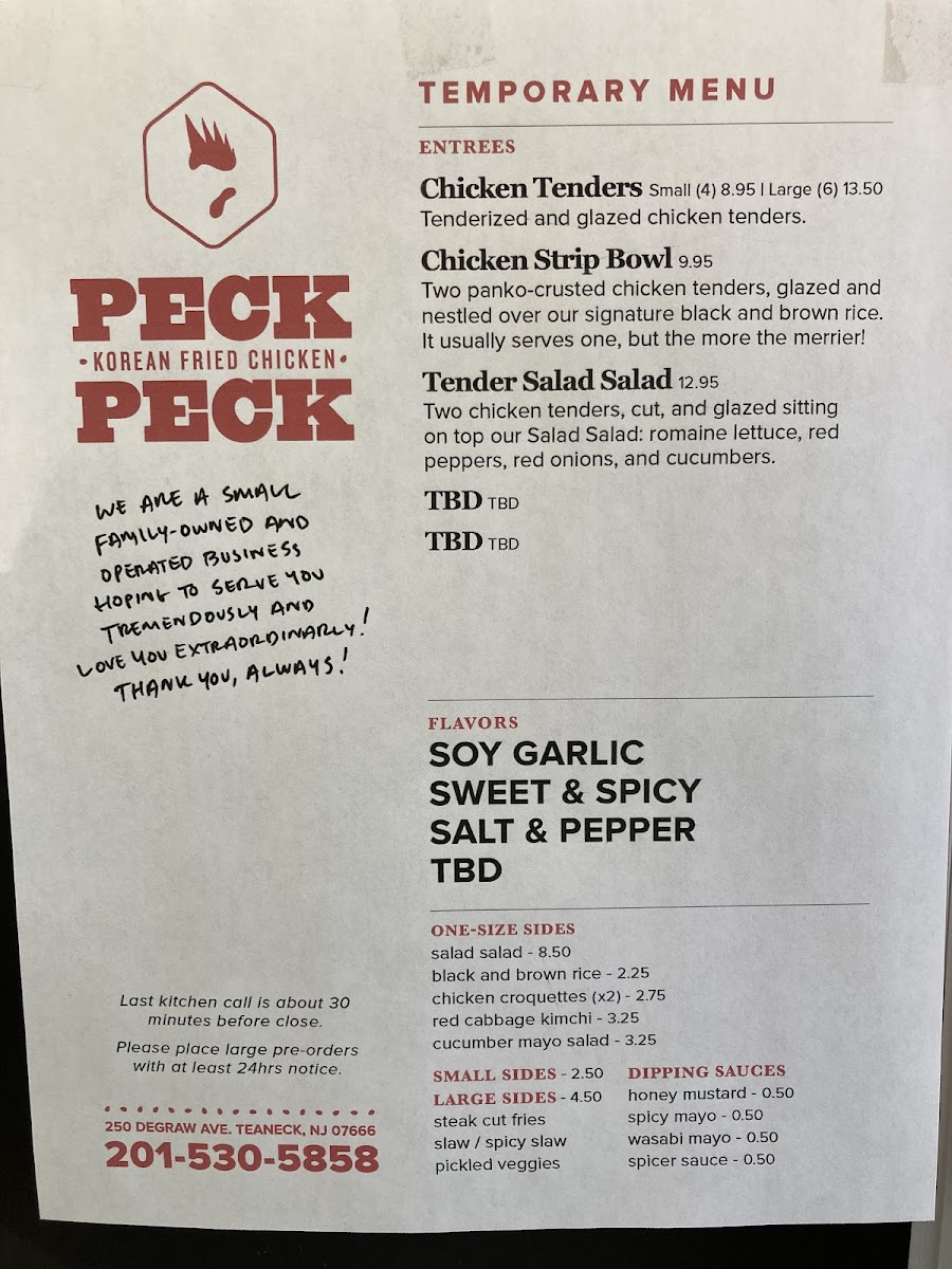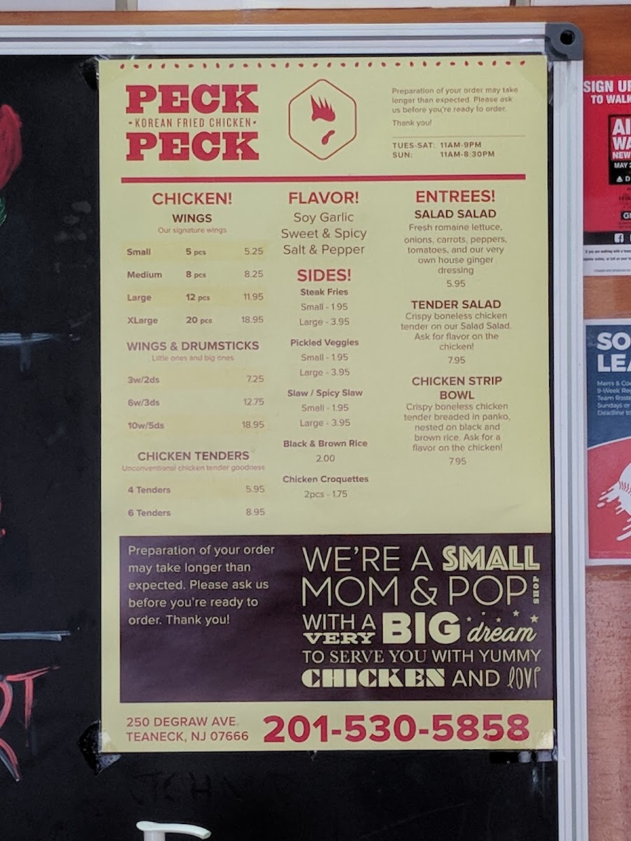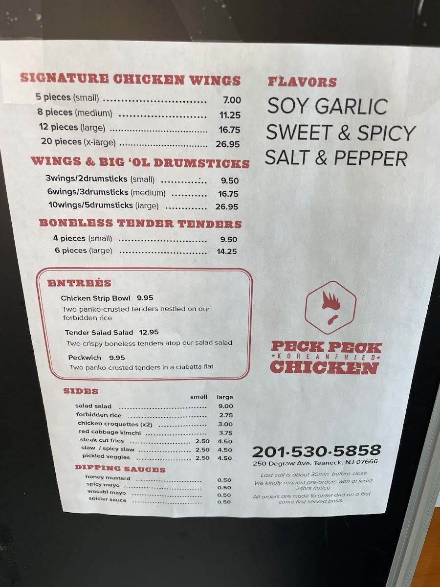 Located at 250 Degraw Ave, Teaneck, NJ 07666, Peck Peck Chicken may appear unassuming from the outside, but step inside and prepare for a delightful journey into the world of Korean fried chicken. This charming eatery has quickly earned a reputation as a neighborhood treasure, winning hearts and taste buds alike with its authentic flavors and inviting atmosphere.